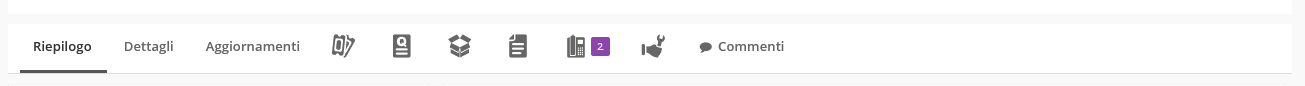 - Le varie icone dei moduli collegati: possiamo vedere tutti i valori presenti in altri moduli e riconducibili a quello specifico contatto, come ticket di assistenza, preventivi, prodotti, documenti, chiamate, servizi o commenti.