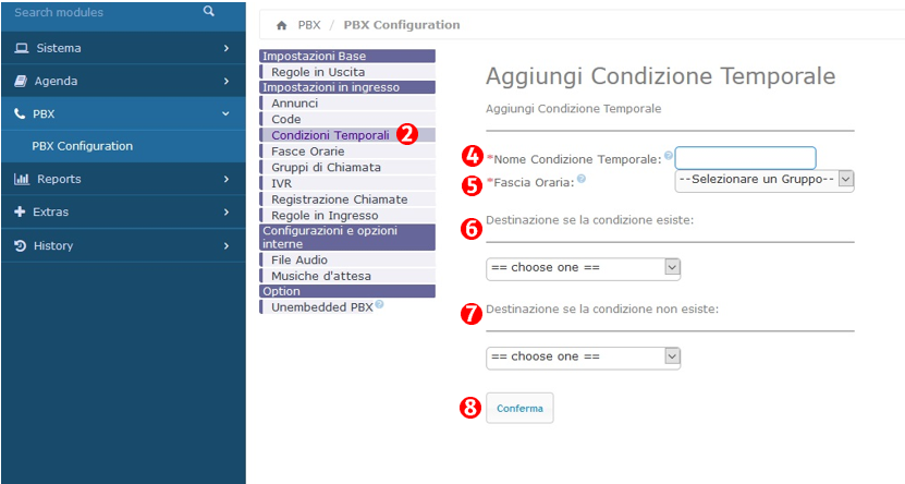 6. Ora configuriamo il comportamento “destinazione se la condizione esiste”, ovvero dire al centralino cosa fare quando durante gli orari previsti nella “fascia oraria” selezionata in precedenza. Ad esempio: