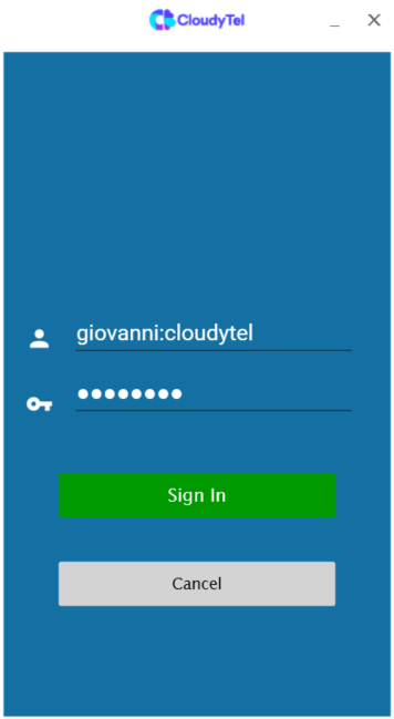 Una volta aperta l’app, apparirà la schermata di login. Basterà inserire le credenziali fornite da CloudyTel e cliccare su “Sing in“