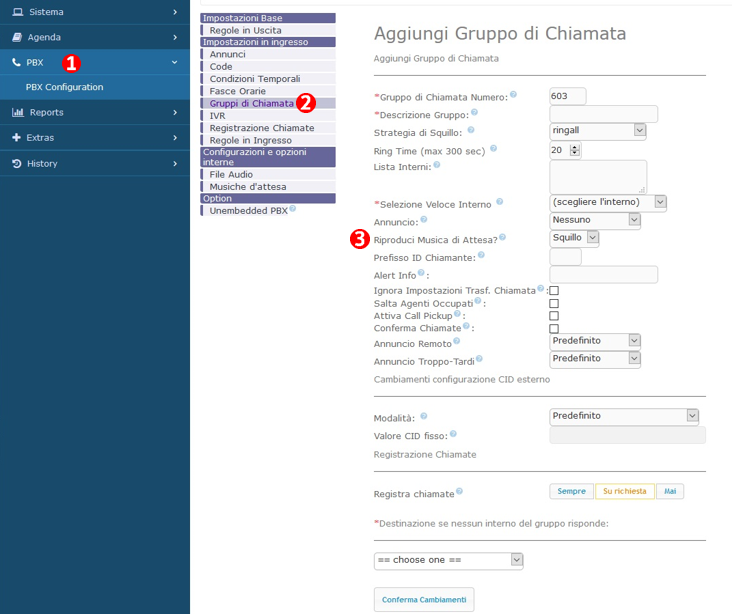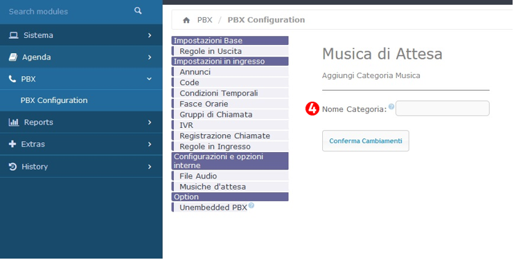 1. Dal menù a scomparsa Selezionare PBX>PBX CONFIGURATION>