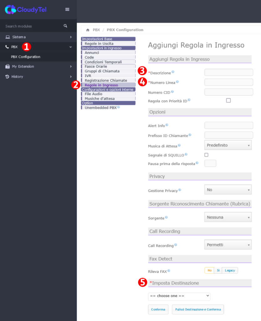 - Nella voce “descrizione” bisogna inserire una descrizione per identificare questa rotta in fase di modifica successiva delle funzioni del centralino (ad esempio si può inserire il numero fornitovi da CloudyTel oppure degli identificativi come “ingresso linea 1”, “ingresso numero verde”)