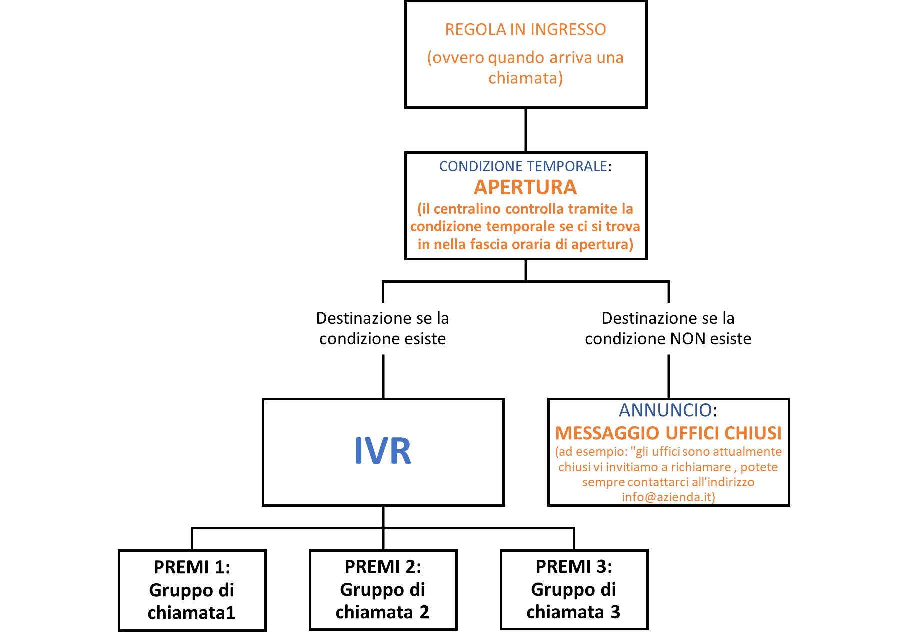 Per esempio, nel caso venga scelta l’opzione “uffici aperti”, il centralino controllerà esclusivamente l’apertura o chiusura degli uffici. Facendo riferimento a uno schema di questo tipo: